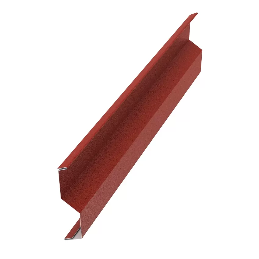 Пристенная планка накладная для металлочерепицы. Служит для оформления примыкания листов металлочерепицы к стене или трубе. Монтируется в стену, накрывая верхнюю часть элемента "Планка примыкания".