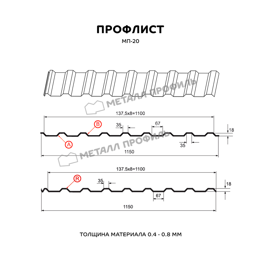 Профиль МП-20 имеет толщину 0,45 мм, что обеспечивает прочность и долговечность конструкции.