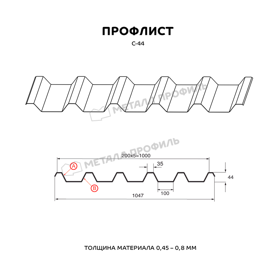 Профиль С-44 имеет толщину 0,5 мм, что обеспечивает прочность и долговечность конструкции.